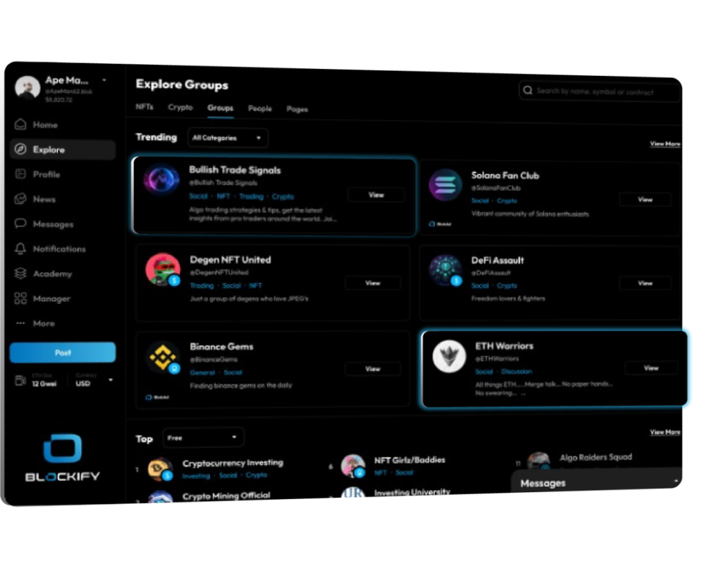 Blockify groups reimagines what the ownership economy currently encompasses. Create 2 Earn utility will provide needed motivational forces to further adoption and increase usership. Think Reddit, Facebook and Discord combined with the power of Web3 and true ownership. Blockify provides users a platform to create, grow and monetize their following while providing growth tools and analytics to foster adoption. Creators have the freedom to build and grow without boundaries and the resources to drive innovation. Utilizing smart contracts for group ownership combines the purest elements of Web3; creators own their group, not us & not big tech.